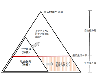 私の理解するところでは,戦後70年余に渡って張ろうとして張りきれなかったセーフティネットを,生活モデルの原則に沿って張り切ることを目指す政策は,その候補の一つであると思われる。戦後日本における広義の社会保障は,ナショナルミニマム(最低生活水準)を基準として,それ以下の経済水準の人々を最低限度まで引き上げる(救貧)とともに,社会保険などを活用して,最低限度以上の生活水準にある人々が最低生活水準以下に転落することを予防する(防貧)ことで,セーフティネットを張ることを目指してきた。だが,その結果として,①制度の隙間をすり抜けて困窮する人々,②ナショナルミニマム以下の生活水準にありながら支援を受けられない人々,③非経済的な理由で生活困難に陥る人々が各所に存在するという,およそ生存権保障の理念からかけ離れた不完全なセーフティネットしか張ることができなかった,ということは紛れもない事実である。